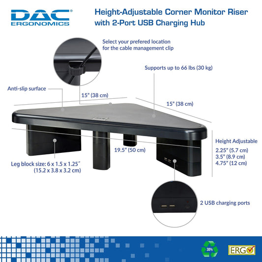DAC® Stax MP-214 Height-Adjustable Corner Monitor/Laptop Stand with 2-USB Ports, Black
