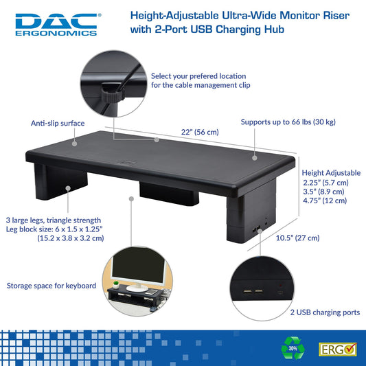 DAC® Stax MP-212 Height-Adjustable Ultra-Wide Monitor/Laptop Stand with 2-USB Ports, Black